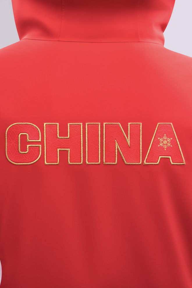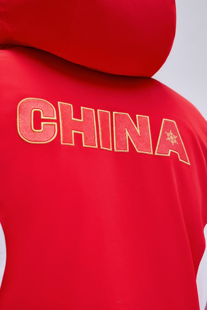 这套领奖装备在视觉语言上,选用了“中国红”与“雪山白”作为主色调,红色充分彰显中国文化元素,在正面勾勒出了象征着五角星的线条;而白色则被赋予了双重含义,它的灵感源自冬季运动场景,同时融入了东方审美里的留白意境,点缀其间的金色线条则以雪道为原型,全身以上红下白的色彩拼接,凸显中国运动健儿的挺拔身姿。