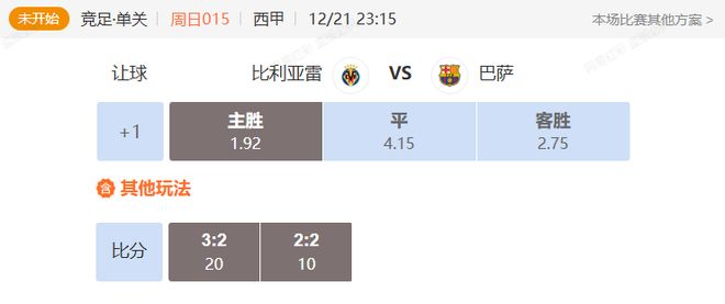 1.基本面:本赛季比利亚雷亚尔15轮11胜2平2负,进31球丢13球积35分,排名第3,主场7胜1平。巴塞罗那17轮14胜1平2负,进49球丢20球积43分,排名第1,客场5胜1平2负。